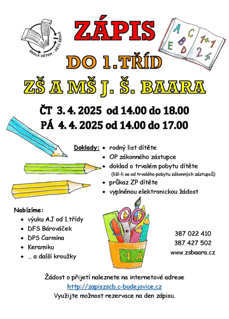 Informace k zápisu do 1. ročníku pro školní rok 2025/2026 Vydávání žádostí o přijetí a o odklad – možnosti získání žádosti o přijetí dítěte nebo o odklad povinné školní docházky: vyplnění formuláře na internetové adrese http://zapiszscb.c-budejovice.cz v době od 1. 3. do 2. 4. 2025, nebo kancelář ZŠ J. Š. Baara v době zápisu 3. a 4. 4. 2025, nebo v případě dotazů k vyplnění formuláře se může […]