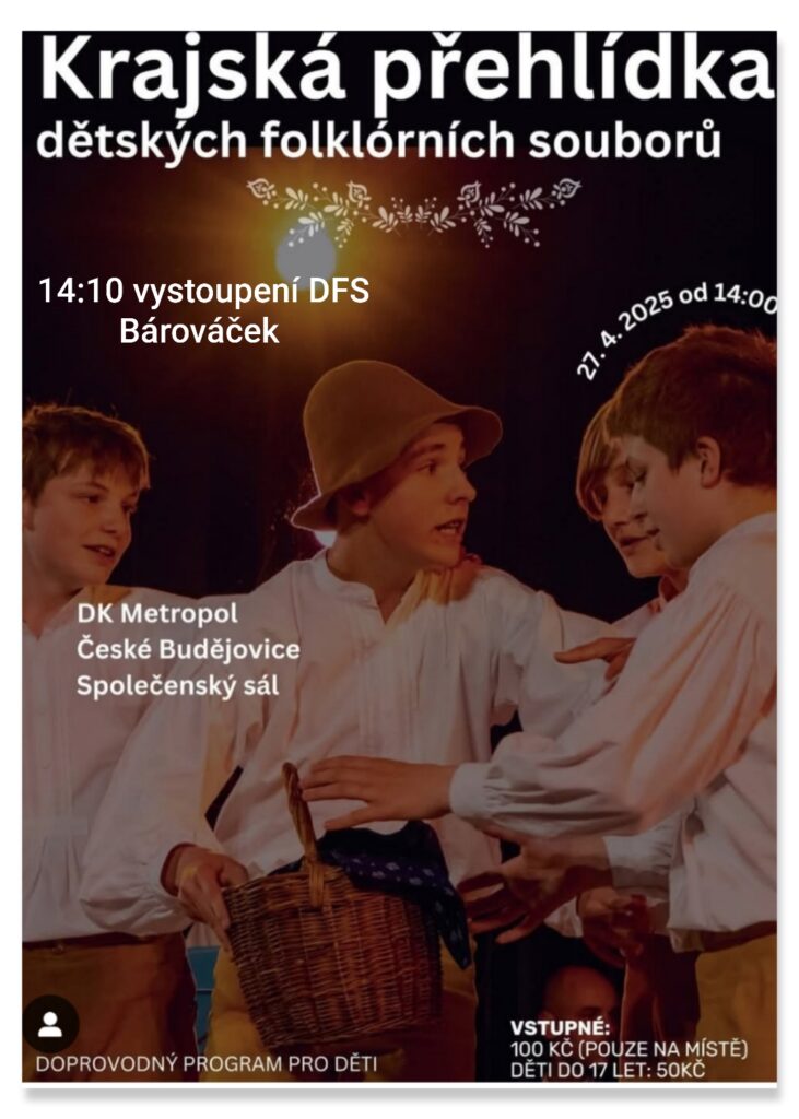 Bárováček vystoupí v rámci Krajské přehlídky dětských folklórních souborů v neděli 27. 4. od 14.00 (14.10) v DK Metropol.