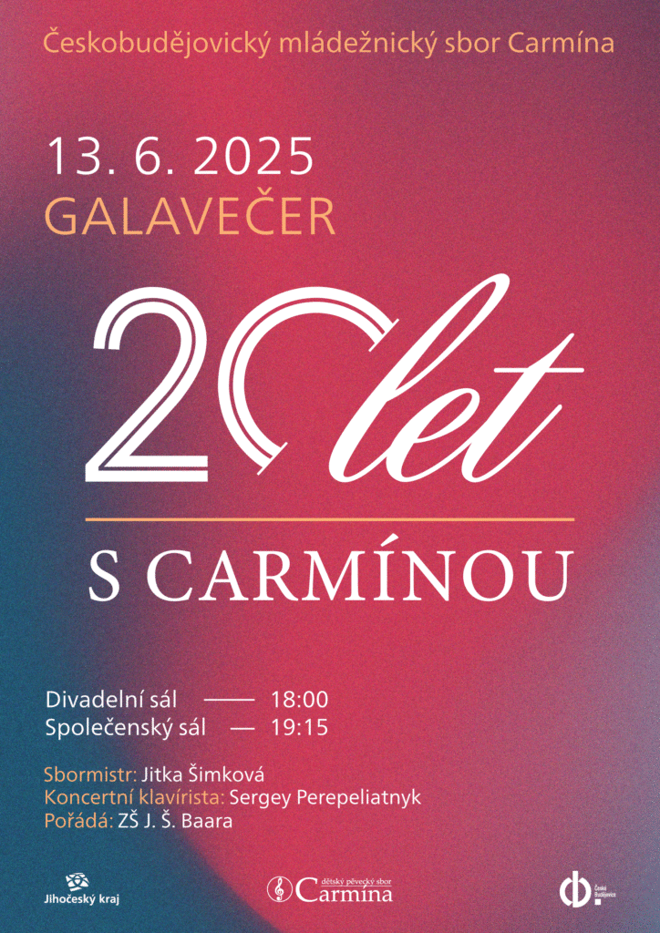 Srdečně Vás zveme na slavnostní Galavečer k 20. výročí Českobudějovického mládežnického sboru Carmína, a to v pátek 13.06. 2025 do DK Metropolu. Vystoupí všech osm našich oddělení sboru ve věku od 3 do 29 let v počtu 290 členů sboru. Galavečer má dvě části: v divadelním sále od 18:00 hodin se uskuteční koncert a od 19:15 ve společenském sále společenská část s kulturním […]